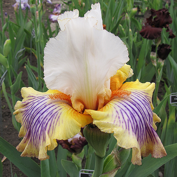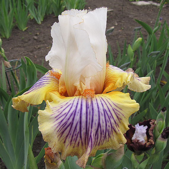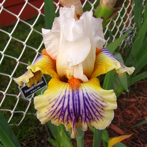 INTERESTING INFO: From the 2004 Bay View Gardens Catalog: At last, here it is: The much anticipated and desired unique origination, not seen before in the iris filament. White domed standards with falls of white with wide yellow shoulders and wide yellow bands. The beards are dark tangerine with blue lines radiating from it over the wide white falls to the yellow band! There are also faint blue dots at the base of the falls. Wonderful show branching, good bud count and vigorous growth.
