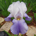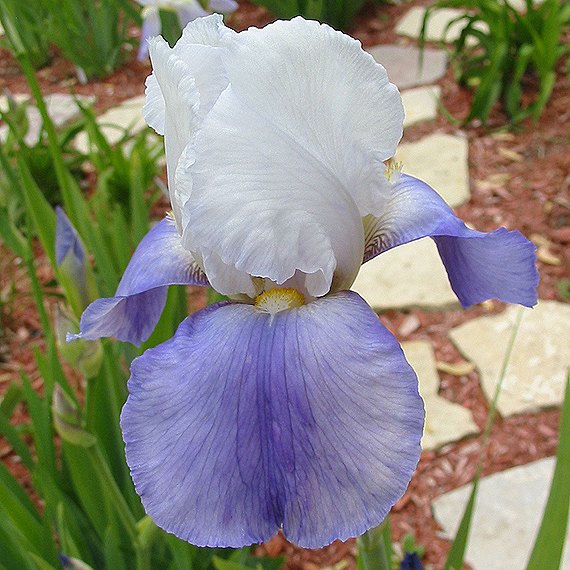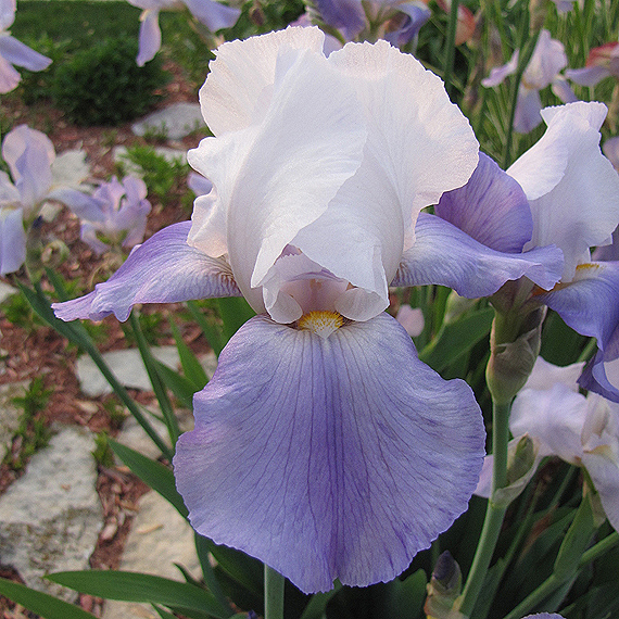 INTERESTING INFO: From the 1965 Schreiner's Iris Lover's Catalog: For the past few years, iris fanciers ahve been extolling the new amoenas with pale blue falls created by Mr. Cook. Whole Cloth is distinct and attractive. Clear opaque white standards, very pure and very rigidly upright and solid, very smooth, medium light blue falls. The blue is the color of Blue Rhythm, its antecedent. Well branched stalks.